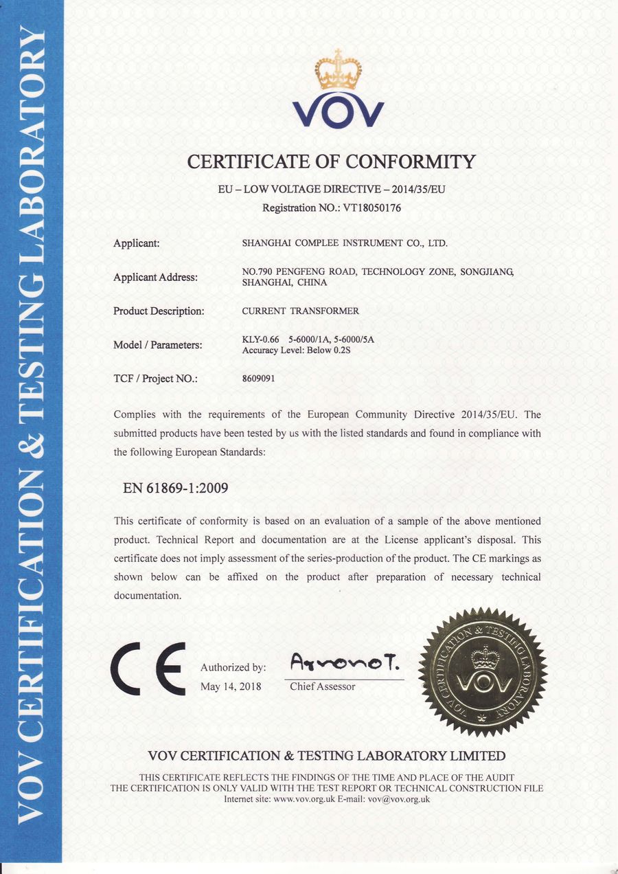 VOV電流互感器CE證書